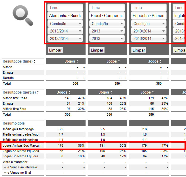 É importante destacarmos que a grande maioria das outras competições como campeonato Espanhol, Italiano ou Inglês também possuem números semelhantes, o que nos mostra que em aproximadamente metade das partidas ambas as equipes conseguem fazer gol, a na outra metade apenas uma equipe faz gol ou então a partida termina em 0X0.