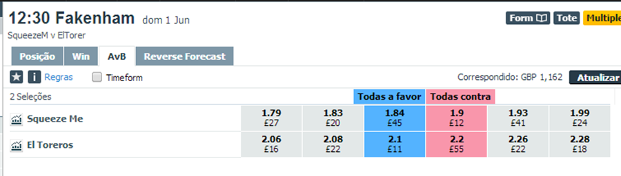 Seria um (Head to Head). Aqui temos uma comparação entre dois cavalos, e o objetivo é acertar qual deles irá finalizar a corrida na frente do outro independente do lugar. Ou seja, não importa se não vencer ou nem acabar no pódio, basta o cavalo que você escolheu acabar na frente do outro. Detalhe, este mercado é muito parelho, não se enganem com as odds. Não acho que seja um mercado +EV, depende muito da situação.