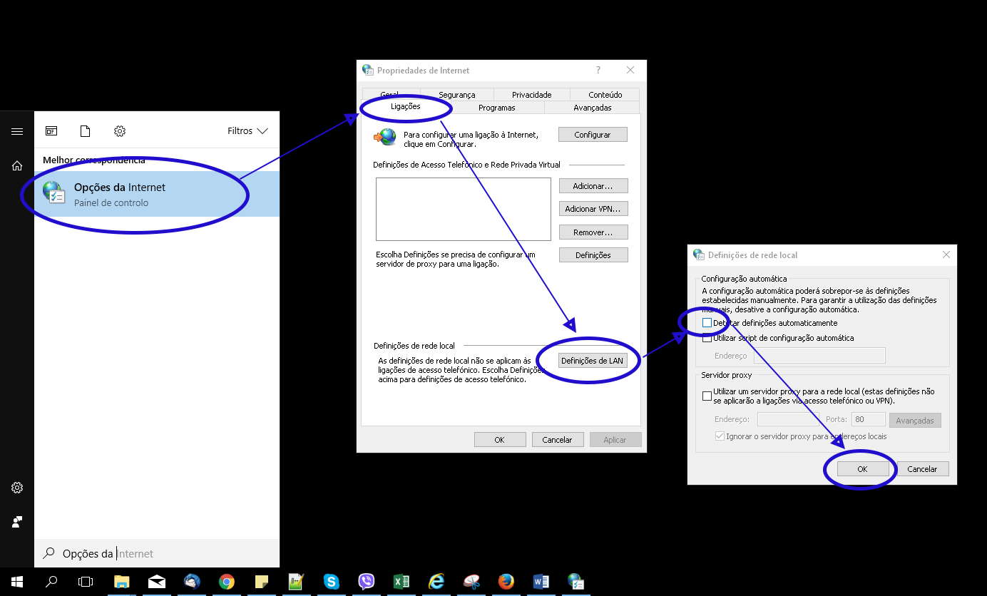> depois DESACTIVAR a opção "Detetar definições automaticamente" e clicar OK.