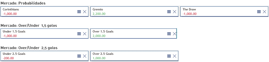Neste jogo do Corinthians vs Grêmio, nós já estivemos a favor dos golos, e depois utilzei o trading para inverter a minha posição e passar a ganhar dinheiro se não houvesse mais golos.