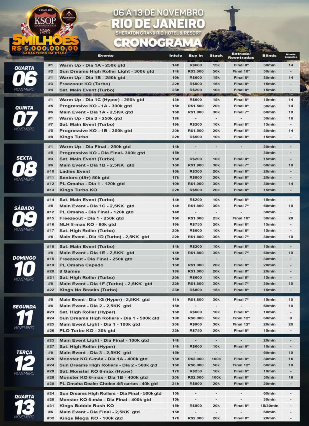 O Main event do KSOP Rio de Janeiro terá o buy-in de R$ 1.800 com 2.500.000 garantidos e também contará com dois High Rollers, sendo que o primeiro será realizado em dias únicos.