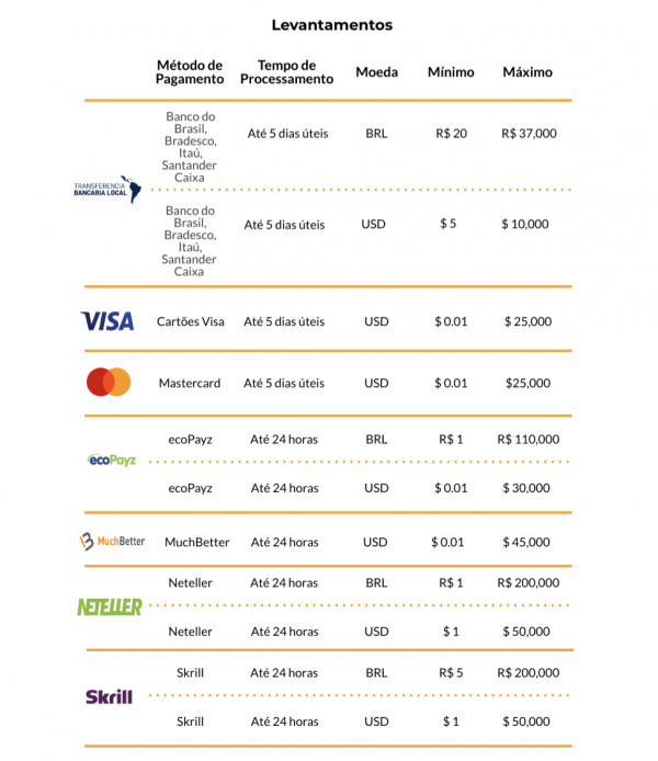Consulte aqui a lista de métodos de pagamentos para depósito e saque: