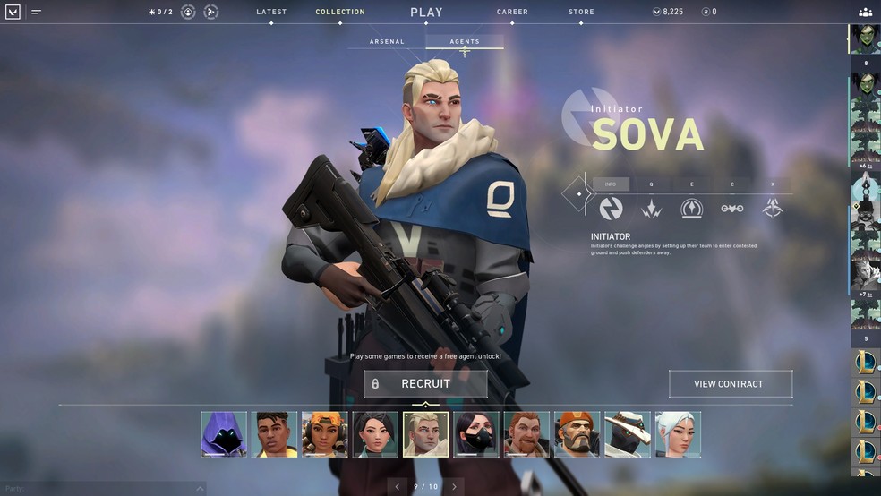 Sova é um iniciador, mas possui grandes habilidades de coletar informações para seus colegas de equipe durante a partida. O Drone Coruja (C) lança dardos marcando os jogadores adversários e revelando suas posições. Já a Flecha Rastreadora (E) é ativada por impacto, revelando a localização dos adversários na linha de divisão. Sova possui também a Flecha de Choque (Q), que explode quando sofre o impacto, e a Fúria do Caçador (X), que dispara uma flecha de energia causando danos e revelando a posição dos inimigos.