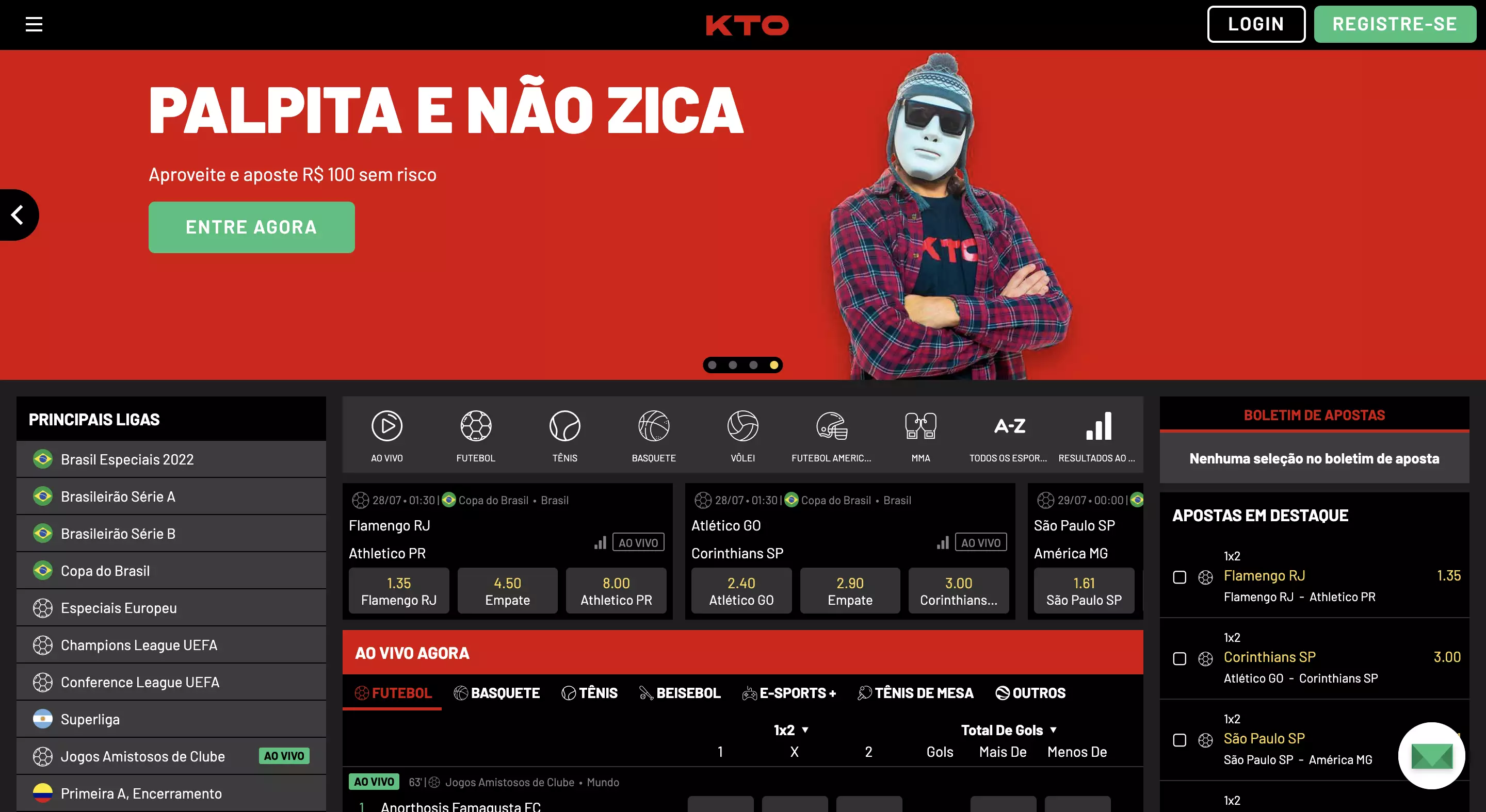 Para fazer uma aposta em Kto Brasil, use as diferentes tabs do site: tem a opção de Jogos do Dia, no separador "Agora e a Seguir", a opção "Competições" e a opção "Destaques".