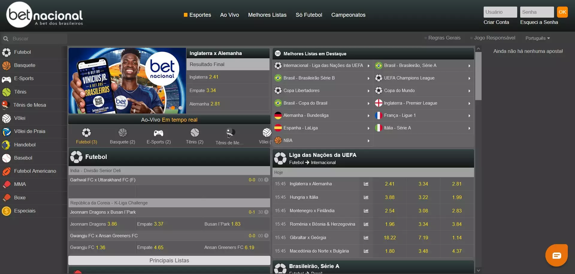 Apesar de ser uma casa recente, a Betnacional oferece variados mercados de apostas, até mesmo alguns que não se encontram em outras casas. Como pode ler abaixo, os esportes tradicionais são o foque, mas há mais por descobrir nesta operadora.O mercado de futebol é particularmente completo nesta casa de apostas. Competições de todo o mundo estão aqui disponíveis, sendo que as ligas brasileiras têm especial presença. Para além da Copa do Brasil ou das diferentes séries do Brasileirão, pode apostar também nos vários campeonatos estaduais.