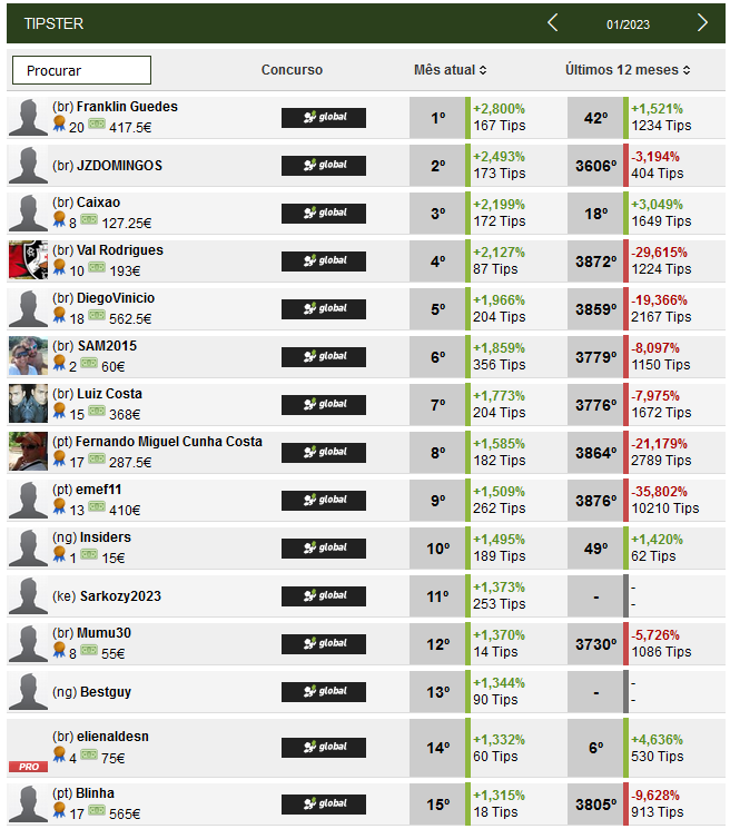 Aproveite também para pesquisar tipsters aqui na Academia das Apostas Brasil. Nessa página, conseguirá navegar por diferentes meses para ficar percebendo a taxa de acerto de cada participante. Ao entrar em esses perfis, poderá consultar antigas e futuras tips de cada um.