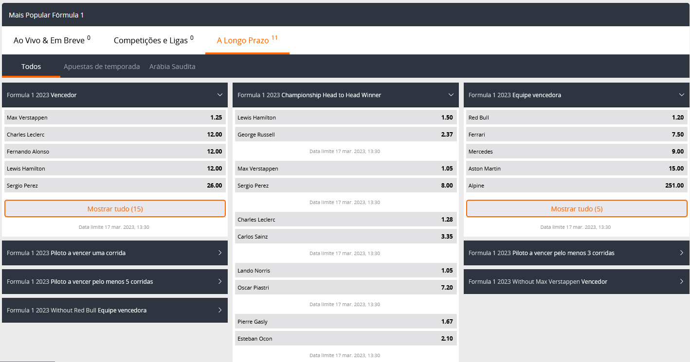 Aqui, você poderá também ficar sabendo os mercados e tipos de apostas mais importantes na F1 – para esta temporada de 2023 e não só. Para lhe facilitar a pesquisa, reunimos também várias odds de favoritos e não só, tudo para que esteja a par de todas as cotas.