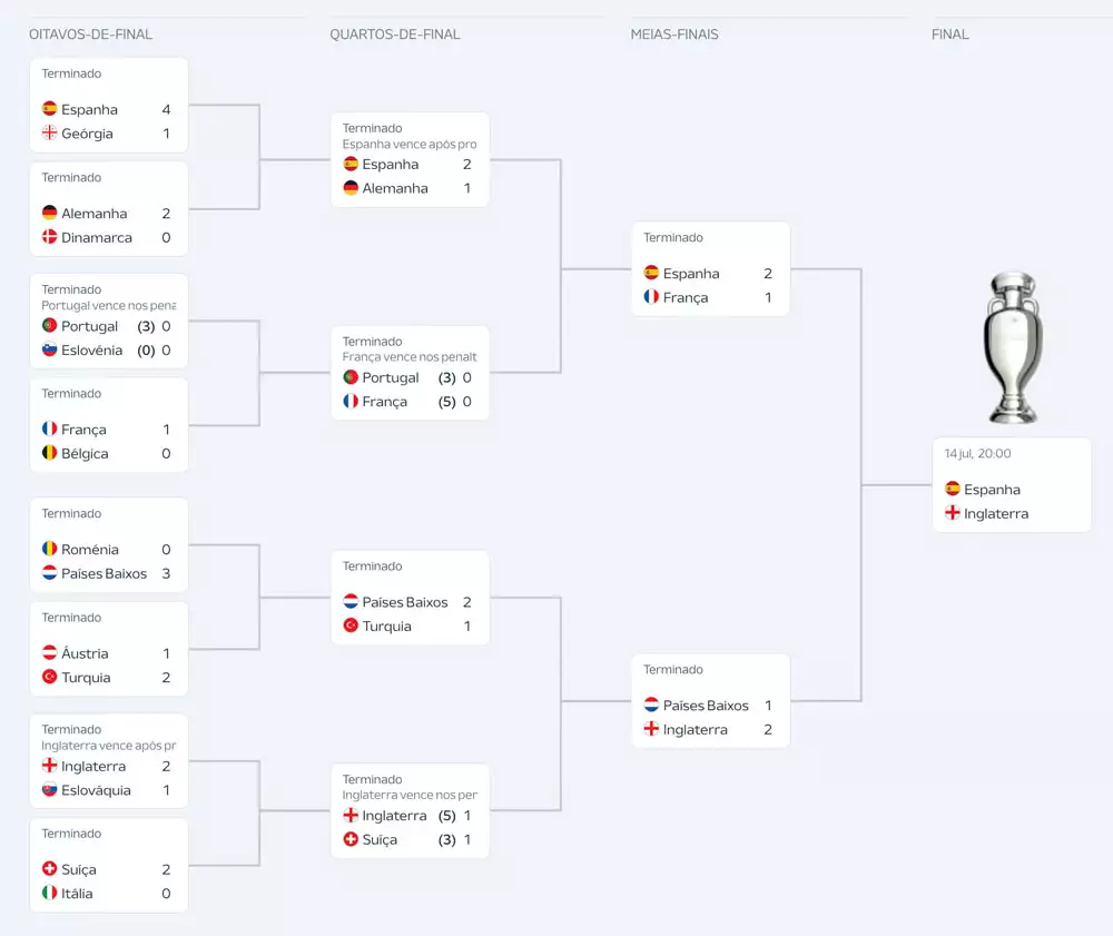 - Espanha vs. Inglaterra: 14 de julho, domingo, às 16:00