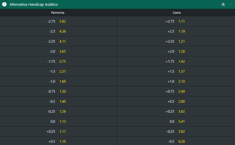 - Handicap europeu: baseado em linhas inteiras (como -1, +1, -2, +2), tem o empate como uma possibilidade;