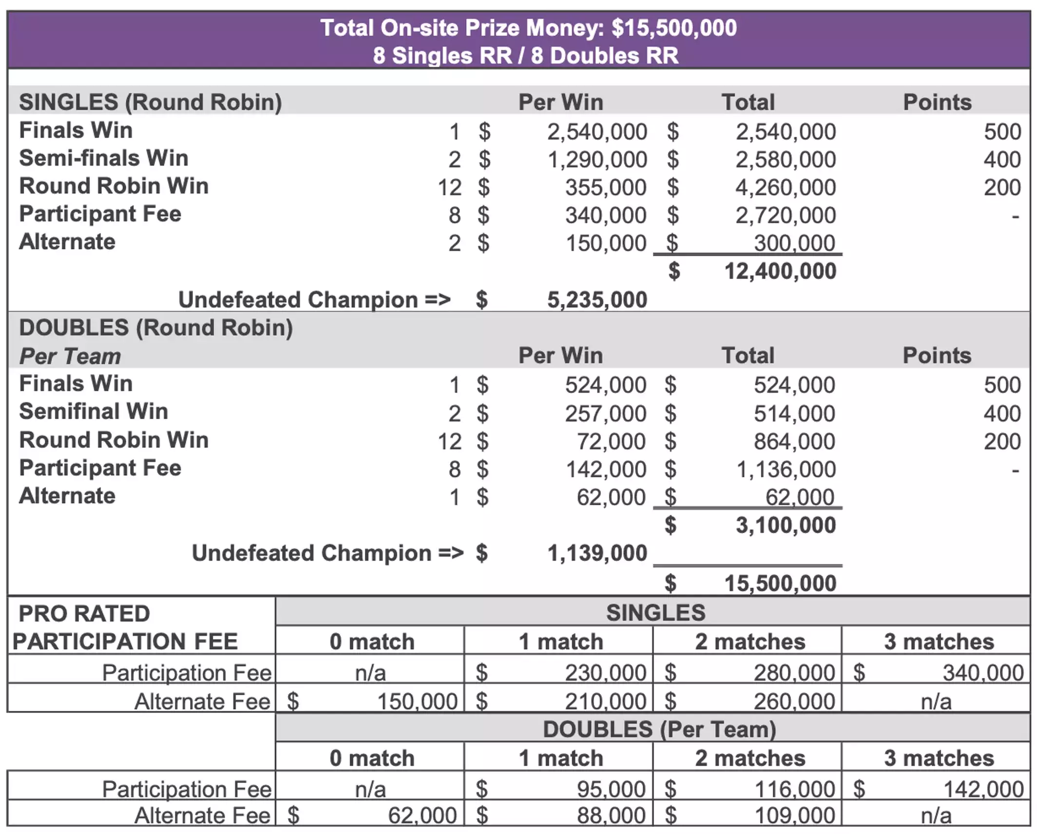 O torneio distribui cerca de 15 milhões de dólares em prêmios, o que aumenta ainda mais a motivação das jogadoras que chegam ao fim de uma temporada longa e desgastante.